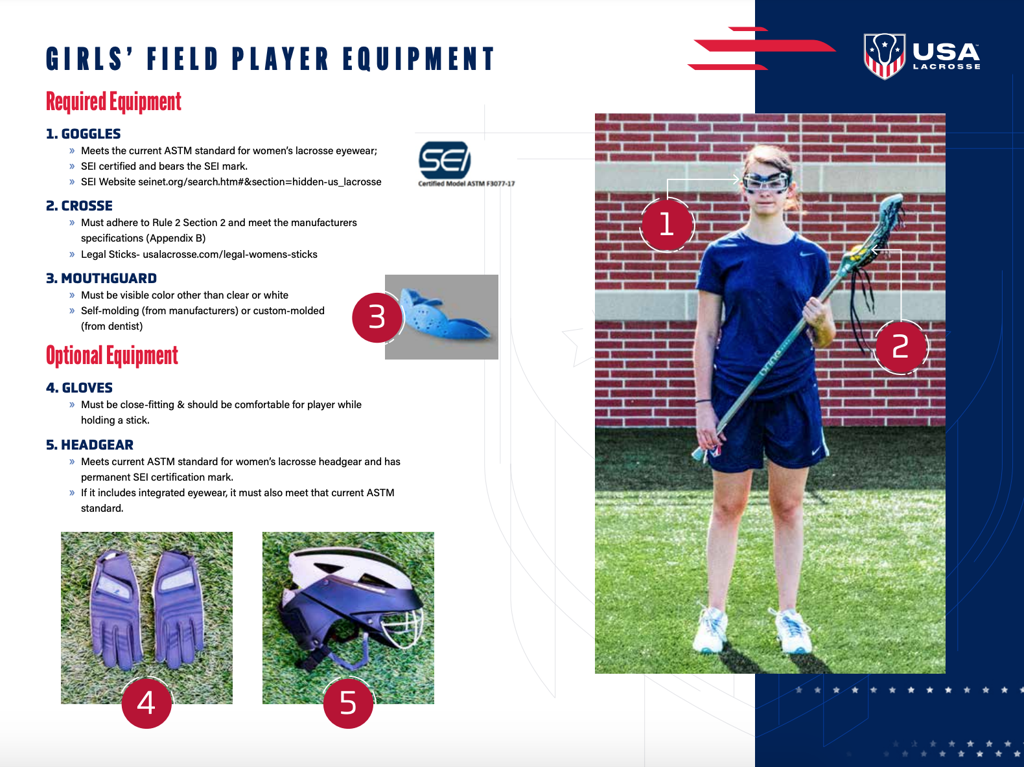 Girl's Equipment: Women's lacrosse stick, protective eye goggles, mouthguard.