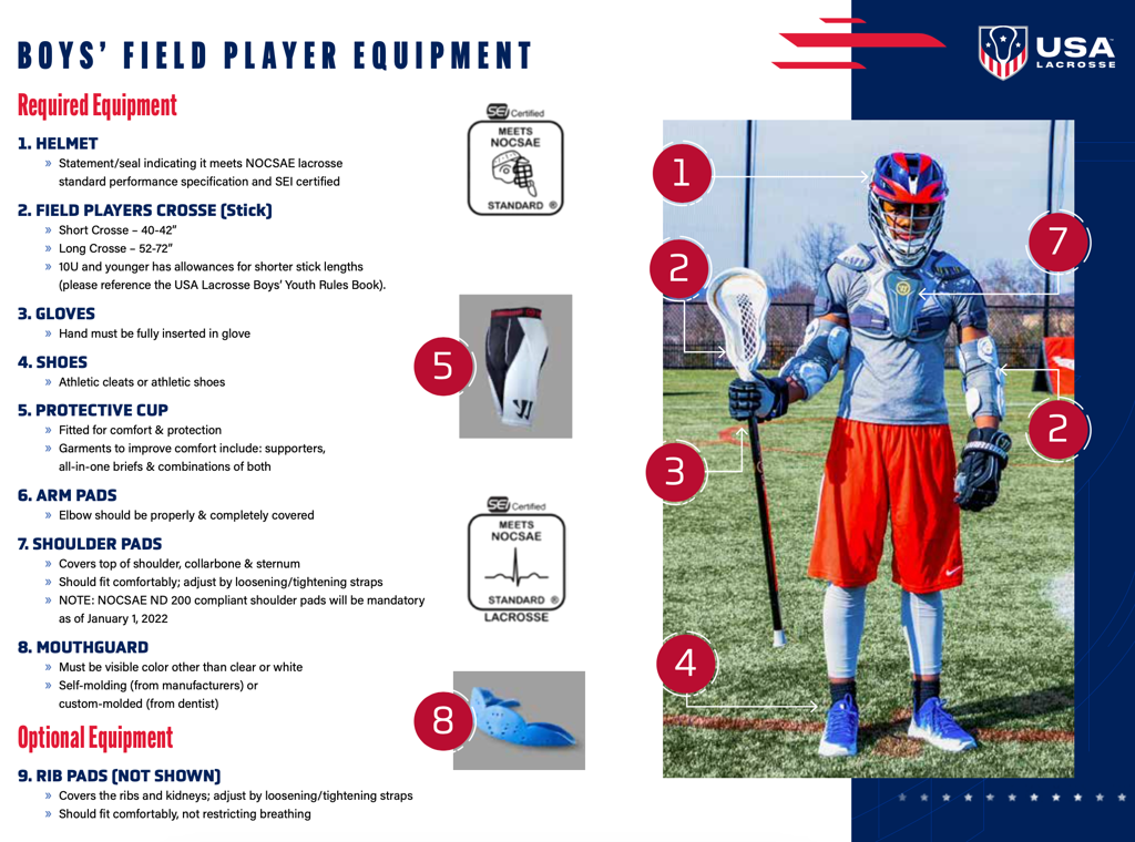 Boy's Equipment: Men's lacrosse stick, helmet, shoulder pads, elbow pads, gloves, mouthguard. Important: The rules require that shoulder pads meet a new safety standard. Make sure that the shoulder pads you purchase meet the NOCSAE certification.